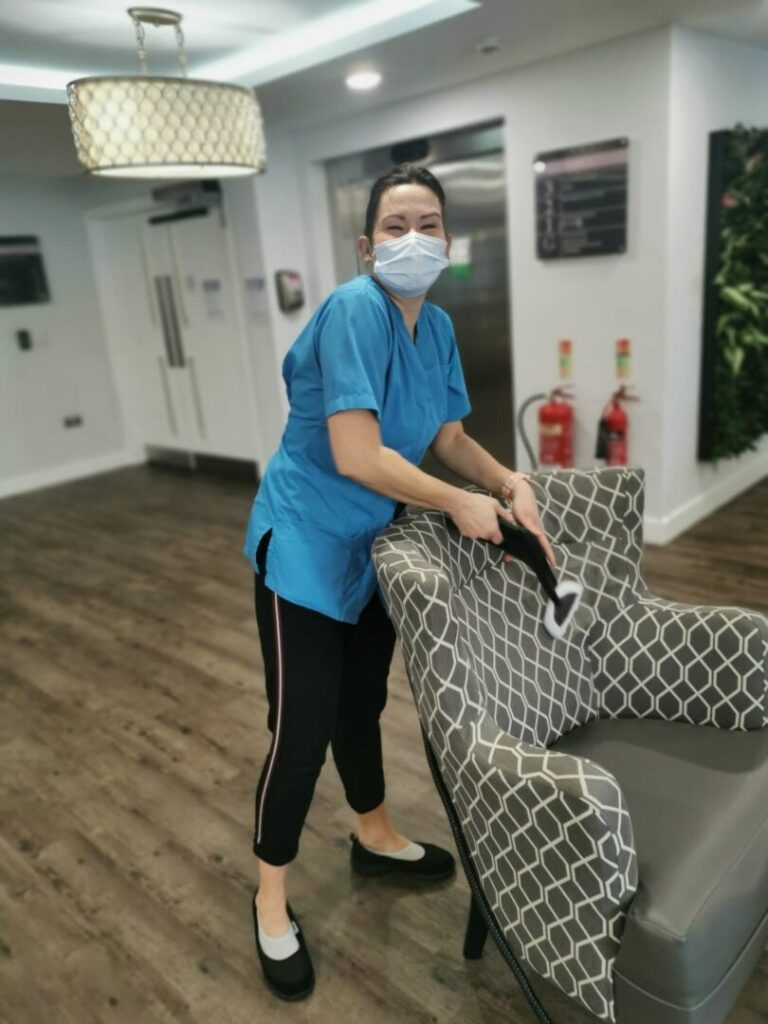 This is Alex our Head Housekeeper at our Willow Rose home. She steams all soft furnishings all week with her team to keep everyone as safe as possible. This is just one element of the enhanced cleaning regimes that we have in place in all our homes. Alex and her team do a fantastic job and Alex always has a smile on her face – such a shame the mask hides it as she has a lovely smile that cheers us all up.